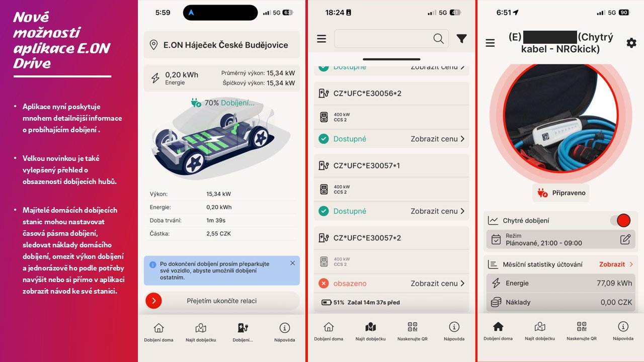 Společnost E.ON dokončila rozsáhlou modernizaci svého systému pro uživatele elektromobility E.ON Drive a po sedmi letech provozu přešla na novou platformu AMPECO. Tato změna, která se týká více než 25 000 aktivních zákazníků a přes 2 250 dobíjecích bodů na 1 688 stanicích, přináší výrazně komfortnější a přehlednější práci s dobíjením elektromobilu. Uživatelé E.ON Drive v loňském roce provedli 870 000 dobíjecích cyklů a odebrali přes 17,2 GWh energie, a to nejen v Česku, ale díky roamingu také v zahraničí, kde nejčastěji dobíjeli na Slovensku, v Německu a Rakousku.